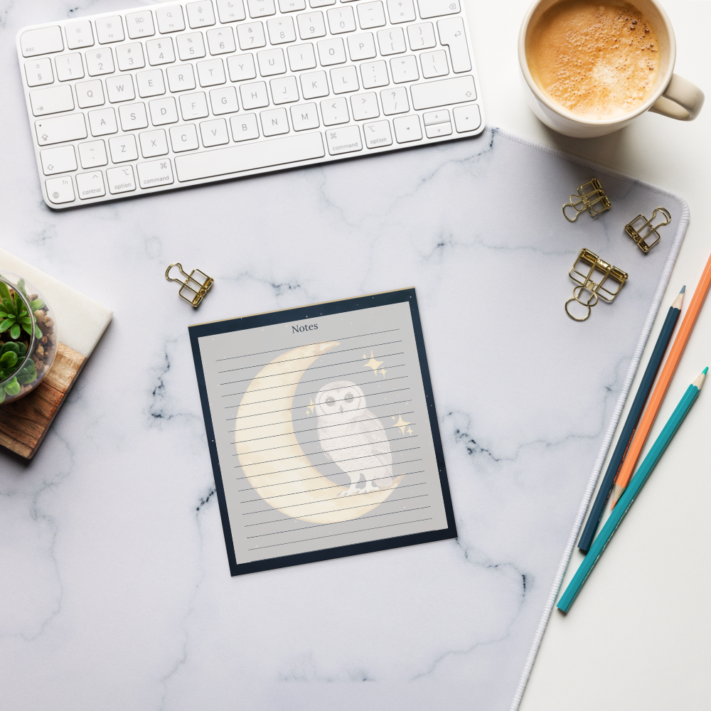This notepad pairs beautifully with the Celestial Owl Hardcover Journal and Spiral Notebook, creating a cohesive stationery collection designed for everyday use.